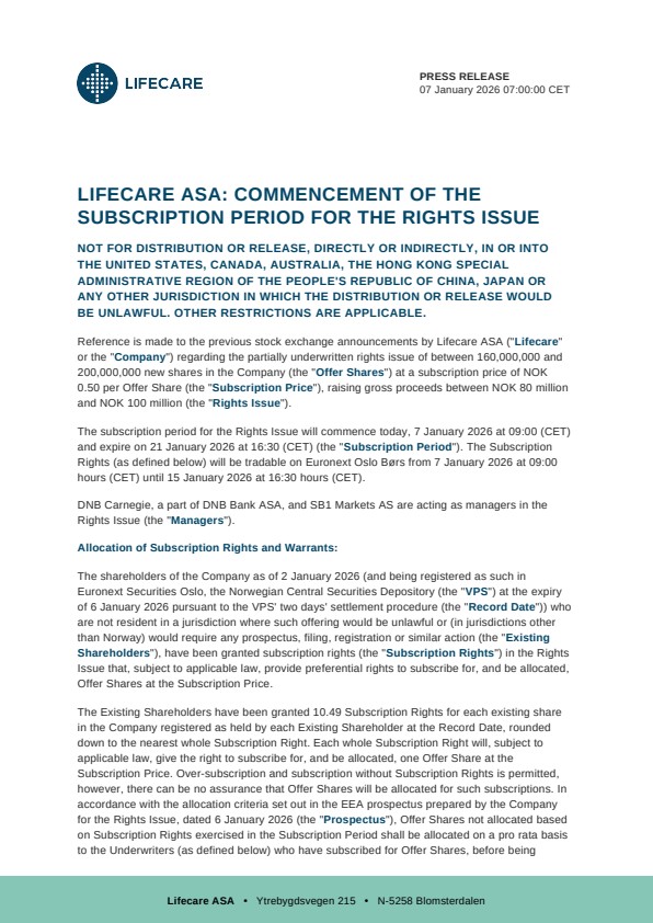 Reference is made to the previous stock exchange announcements by Lifecare ASA (“Lifecare” or the “Company“) regarding the partially underwritten rights issue of between 160,000,000 and 200,000,000 new shares in the Company (the “Offer Shares“) at a subscription price of NOK 0.50 per Offer Share (the “Subscription Price“), raising gross proceeds between NOK 80 million and NOK 100 million (the “Rights Issue“).