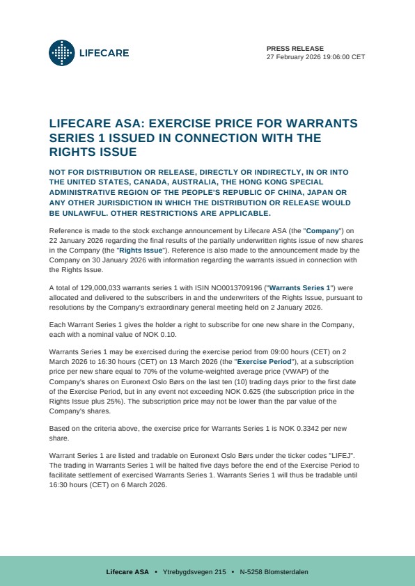 Reference is made to the stock exchange announcement by Lifecare ASA (the “Company“) on 22 January 2026 regarding the final results of the partially underwritten rights issue of new shares in the Company (the “Rights Issue“). Reference is also made to the announcement made by the Company on 30 January 2026 with information regarding the warrants issued in connection with the Rights Issue.