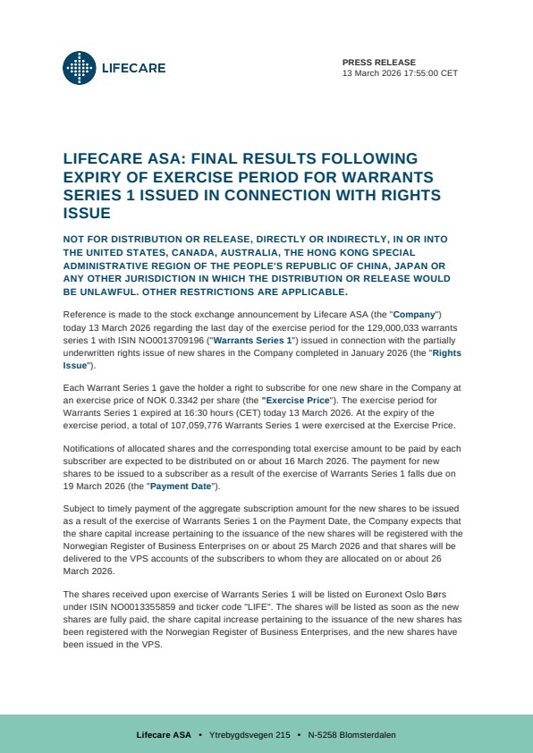 Reference is made to the stock exchange announcement by Lifecare ASA (the “Company“) today 13 March 2026 regarding the last day of the exercise period for the 129,000,033 warrants series 1 with ISIN NO0013709196 (“Warrants Series 1“) issued in connection with the partially underwritten rights issue of new shares in the Company completed in January 2026 (the “Rights Issue“).
