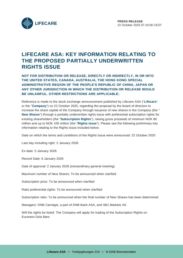 Reference is made to the stock exchange announcement published by Lifecare ASA (“Lifecare” or the “Company“) on 22 October 2025, regarding the proposal by the board of directors to increase the share capital of the Company through issuance of new shares in the Company (the “New Shares“) through a partially underwritten rights issue with preferential subscription rights for existing shareholders (the “Subscription Rights“), raising gross proceeds of minimum NOK 80 million and up to NOK 100 million (the “Rights Issue“). Please see the following preliminary key information relating to the Rights Issue included below.
