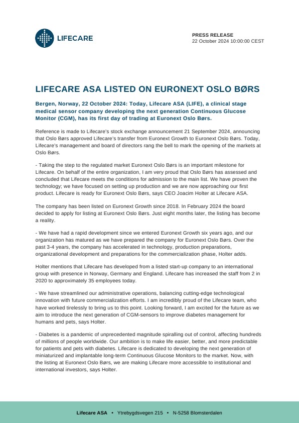 Bergen, Norway, 22 October 2024: Today, Lifecare ASA (LIFE), a clinical stage medical sensor company developing the next generation Continuous Glucose Monitor (CGM), has its first day of trading at Euronext Oslo Børs.