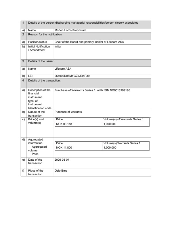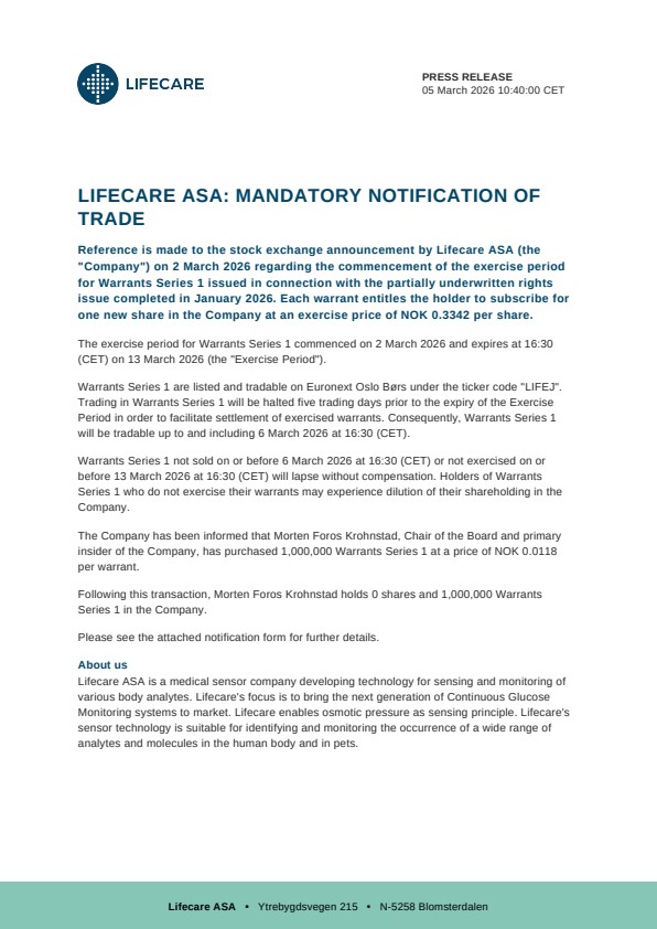 Reference is made to the stock exchange announcement by Lifecare ASA (the “Company”) on 2 March 2026 regarding the commencement of the exercise period for Warrants Series 1 issued in connection with the partially underwritten rights issue completed in January 2026. Each warrant entitles the holder to subscribe for one new share in the Company at an exercise price of NOK 0.3342 per share.