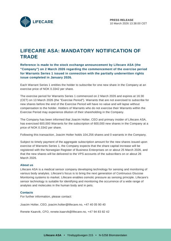 Reference is made to the stock exchange announcement by Lifecare ASA (the “Company”) on 2 March 2026 regarding the commencement of the exercise period for Warrants Series 1 issued in connection with the partially underwritten rights issue completed in January 2026.