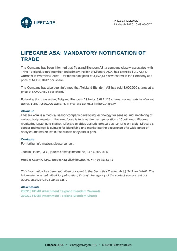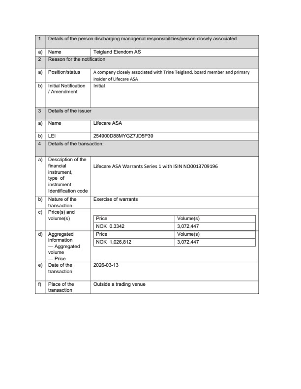 The Company has been informed that Teigland Eiendom AS, a company closely associated with Trine Teigland, board member and primary insider of Lifecare ASA, has exercised 3,072,447 warrants in Warrants Series 1 for the subscription of 3,072,447 new shares in the Company at a price of NOK 0.3342 per share.