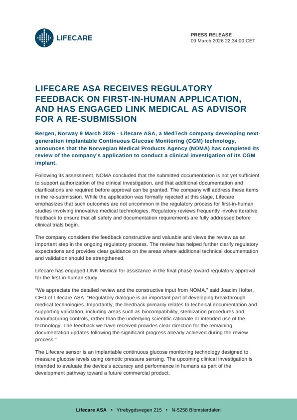 Bergen, Norway 9 March 2026 – Lifecare ASA, a MedTech company developing next-generation implantable Continuous Glucose Monitoring (CGM) technology, announces that the Norwegian Medical Products Agency (NOMA) has completed its review of the company’s application to conduct a clinical investigation of its CGM implant.