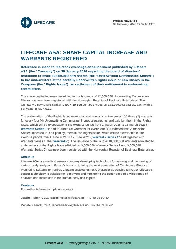 Reference is made to the stock exchange announcement published by Lifecare ASA (the “Company”) on 29 January 2026 regarding the board of directors’ resolution to issue 12,000,000 new shares (the “Underwriting Commission Shares”) to the underwriters of the partially underwritten rights issue of new shares in the Company (the “Rights Issue”), as settlement of their entitlement to underwriting commission.
