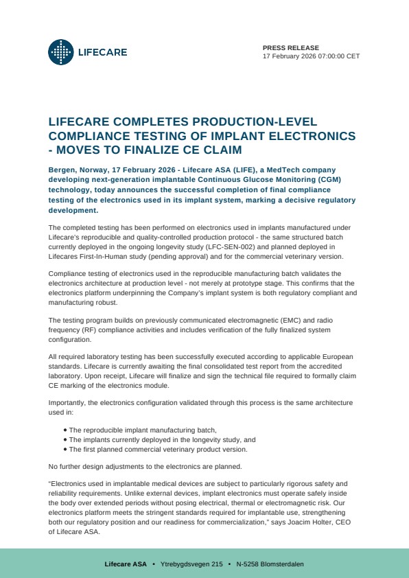 Bergen, Norway, 17 February 2026 – Lifecare ASA (LIFE), a MedTech company developing next-generation implantable Continuous Glucose Monitoring (CGM) technology, today announces the successful completion of final compliance testing of the electronics used in its implant system, marking a decisive regulatory development.