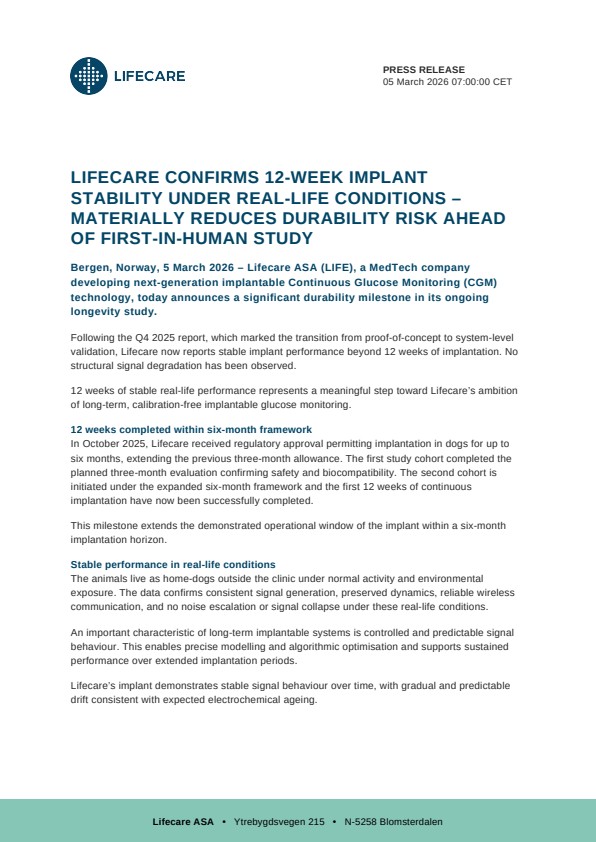 Bergen, Norway, 5 March 2026 – Lifecare ASA (LIFE), a MedTech company developing next-generation implantable Continuous Glucose Monitoring (CGM) technology, today announces a significant durability milestone in its ongoing longevity study.
