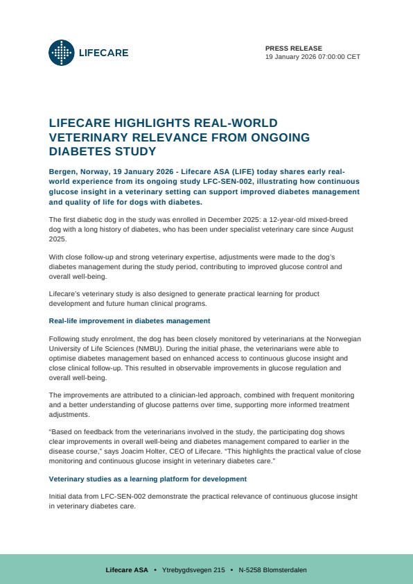Bergen, Norway, 19 January 2026 – Lifecare ASA (LIFE) today shares early real-world experience from its ongoing study LFC-SEN-002, illustrating how continuous glucose insight in a veterinary setting can support improved diabetes management and quality of life for dogs with diabetes.