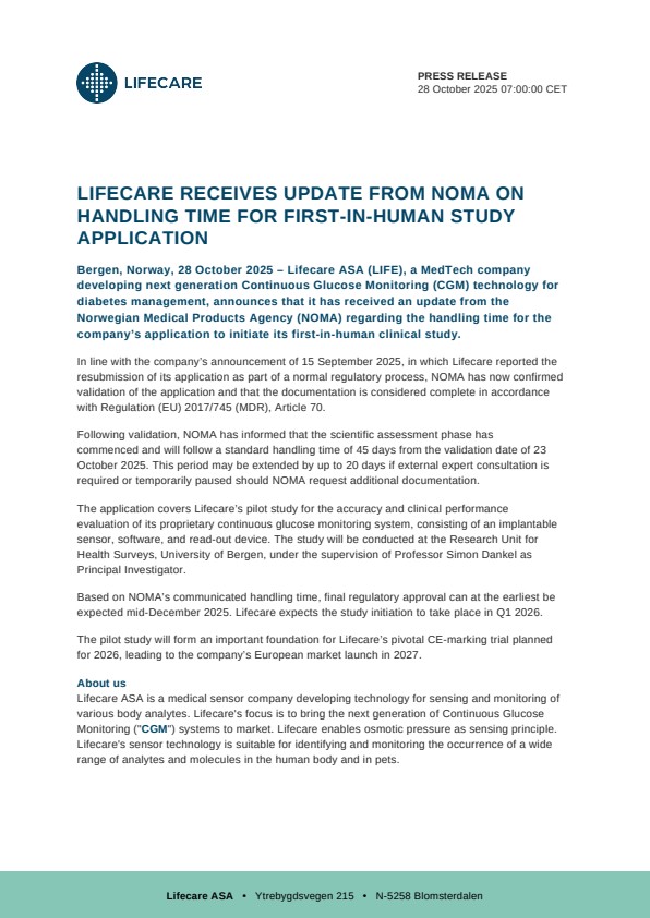 Bergen, Norway, 28 October 2025 – Lifecare ASA (LIFE), a MedTech company developing next generation Continuous Glucose Monitoring (CGM) technology for diabetes management, announces that it has received an update from the Norwegian Medical Products Agency (NOMA) regarding the handling time for the company’s application to initiate its first-in-human clinical study.