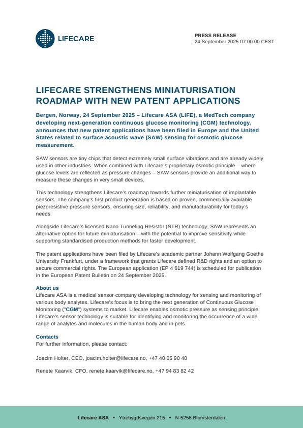 Bergen, Norway, 24 September 2025 – Lifecare ASA (LIFE), a MedTech company developing next-generation continuous glucose monitoring (CGM) technology, announces that new patent applications have been filed in Europe and the United States related to surface acoustic wave (SAW) sensing for osmotic glucose measurement.